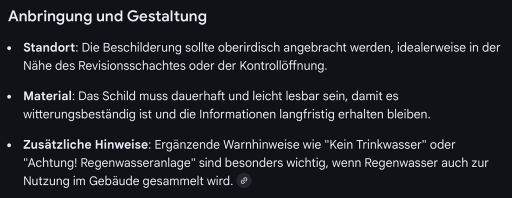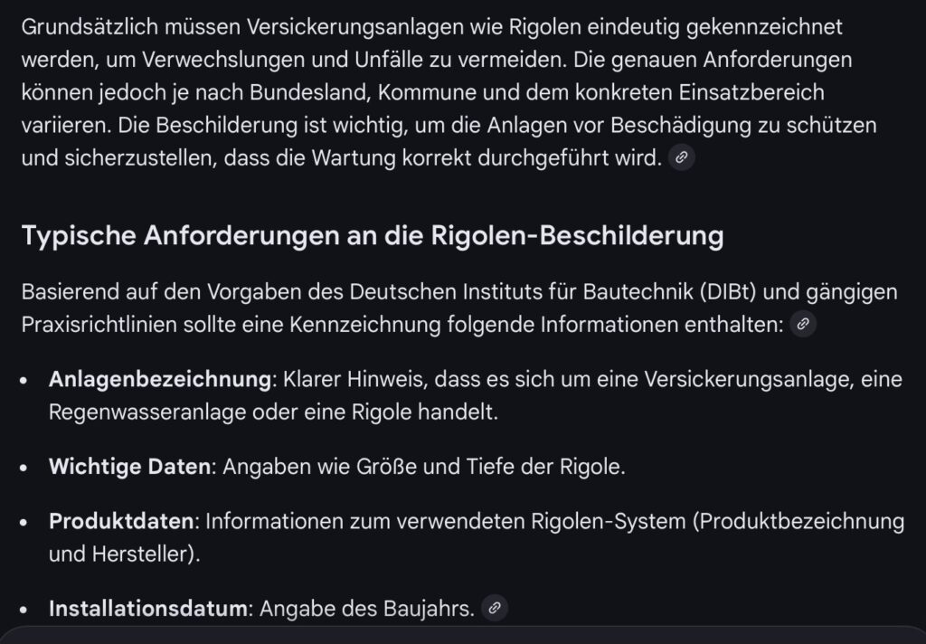 Rigolenbeschilderung Die fertige Rigole ist durch ein Hinweisschild zu kennzeichnen Eine Google-Suche im KI Modus „Rigole Standort Beschilderung“ ergab folgendes Ergebnis. Screenshot (KI Modus Google) Screenshot