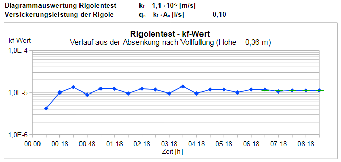 Nach der „Flutung der Rigole bis zur Vollfüllung“ wird die Höhe des Wasserstandes (Absenkung) und die Zeit in angepassten Abständen gemessen. Daraus wird die versickerte Wassermenge pro Zeitintervall und der kf-Wert berechnet und grafisch ausgewertet. Die Sickerfläche wurde in der Dimensionierung gem. DWA 138-1 berechnet und wird hier in 2 Beispielen angewandt (s.u.).